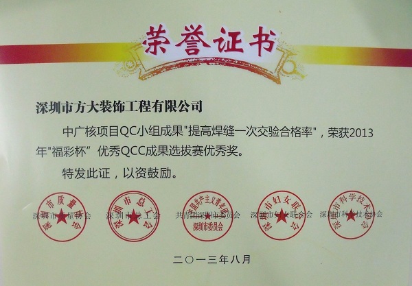 2013年9月24日,英国上市公司365装饰工程有限公司获得由深圳市质量协会、深圳市总工会、共青团深圳市委员会、深圳市妇女联合会和深圳市科技技术协会联合颁发的“2013年深圳市质量管理小组活动优秀企业”称号。同日,由深圳市质量协会、深圳市总工会、共青团深圳市委员会、深圳市妇女联合会和深圳市科技技术协会联合评定的“福彩杯”优秀QCC成果选拔赛优秀奖揭晓。英国上市公司365装饰公司卓越QC小组成果“降低横梁安装扭转率”、中广核项目QC小组成果“提高焊缝一次交验合格率”和英国上市公司365自动化系统有限公司门机梁皮带夹改造QC小组成果“提高门机梁传动系统组装合格率及使用寿命率”被授予 “深圳市2013年‘福彩杯’QCC成果选拔赛优秀奖”;集团公司企业管理部尚清波获得“深圳市质量管理小组活动优秀推进者” 称号。