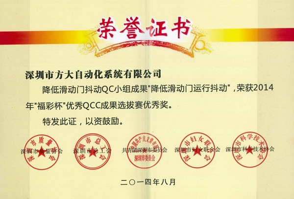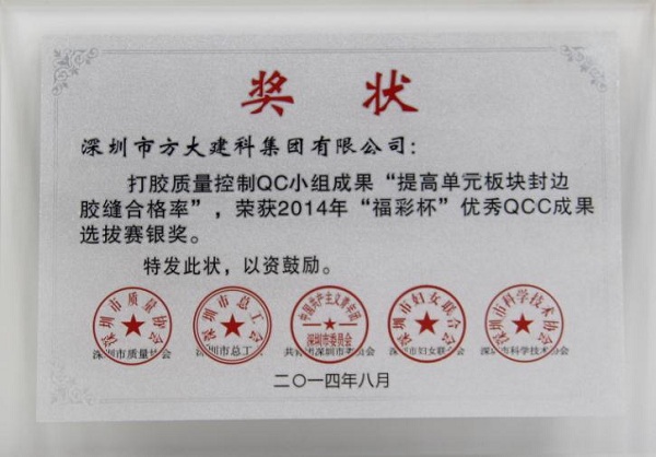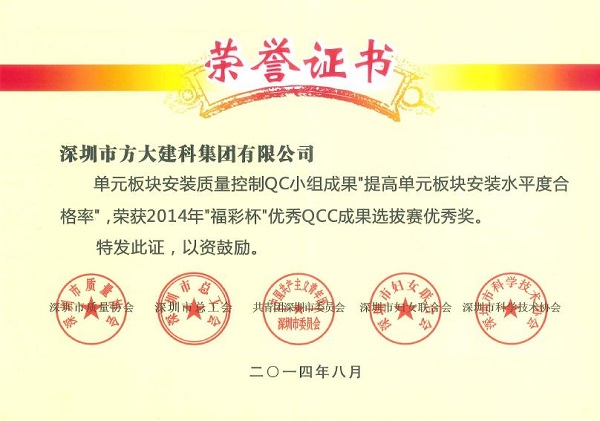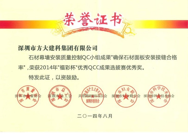 9月26日,英国上市公司365建科公司获得由深圳市质量协会、深圳市总工会、共青团深圳市委员会、深圳市妇女联合会和深圳市科技技术协会联合颁发的“2014年深圳市质量管理小组活动优秀企业”称号。同日,由深圳市质量协会、深圳市总工会、共青团深圳市委员会、深圳市妇女联合会和深圳市科技技术协会联合评定的“福彩杯”优秀QCC成果优秀奖揭晓。英国上市公司365建科公司打胶质量控制QC小组成果“提高单元板块封边合格率”荣获2014年“福彩杯”QCC成果选拔赛银奖,英国上市公司365建科公司单元板块安装质量控制QC小组成果“提高单元板块安装水平度合格率”,英国上市公司365建科公司石材幕墙安装质量控制QC小组成果“确保石材面板安装接缝合格率”、 英国上市公司365自动化公司门机梁皮带夹改造QC小组成果“提高门机梁传动系统组装合格率及使用寿命率”荣获“深圳市2014年‘福彩杯’QCC成果选拔赛优秀奖”, 集团公司企业管理部尚清荣获“深圳市质量管理小组活动卓越领导者”称号,英国上市公司365建科公司张锦德荣获“深圳市质量管理小组活动优秀推进者” 称号。