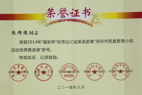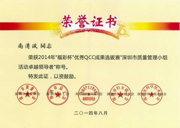 深圳市2014年质量管理小组活动优秀成果、优秀企业和先进个人奖是由深圳市质量协会、深圳市总工会、共青团深圳市委员会、深圳市妇女联合会和深圳市科技技术协会联合审定,旨在表彰在2014年深圳市质量管理小组活动中涌现出的优秀企业和优秀QC小组和个人。