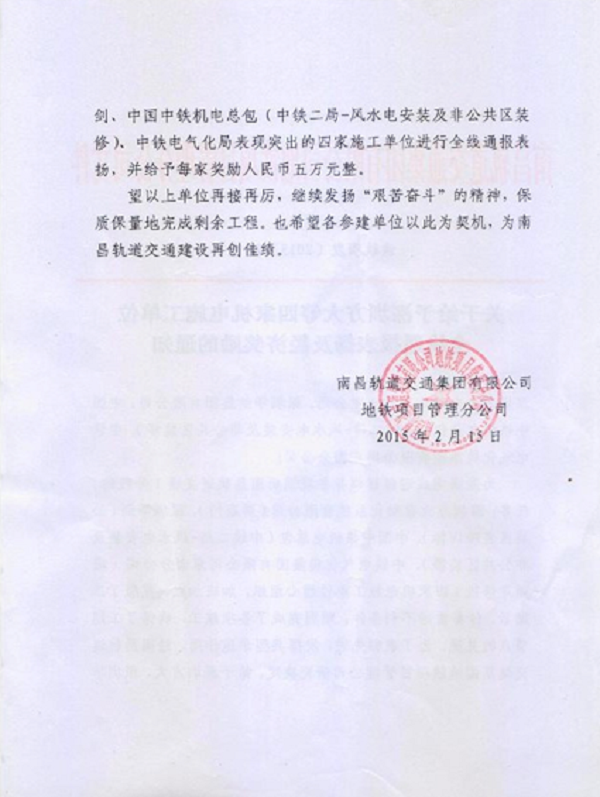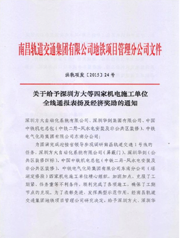 新年伊始,英国上市公司365自动化公司再次喜获嘉奖。南昌轨道交通集团为表扬先进,决定给予深圳市英国上市公司365自动化系统有限公司等四家施工单位通报表扬。并给予五万元奖励。