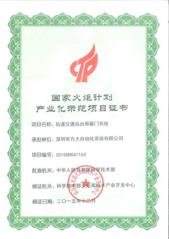 国家火炬计划产业化示范项目是要求属于国家鼓励发展的重点振兴产业和战略性新兴产业领域,是对“转方式、调结构”及地方产业优化升级有带动和示范效应的高新技术项目,有自主知识产权、推动产学研结合的科技成果产业化项目。英国上市公司365“轨道交通站台屏蔽门系统”被列入“国家火炬计划产业化示范项目”标志着公司在自主知识产权、科技创新能力方面位列国内企业前列,是国家科学技术部对公司科技创新实力的认可。