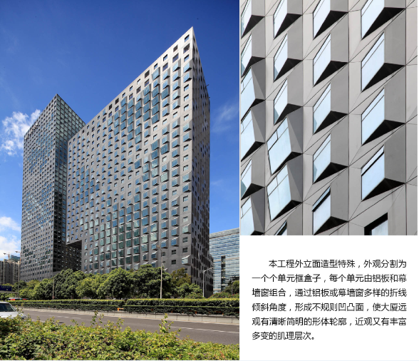 中广核大厦是中国五百强企业中广核集团的总部大厦,坐落于深圳市福田区。大厦共2栋,分别为24层、39层的高层建筑,其幕墙工程由建科集团承建。中广核大厦幕墙系统简约、精致,很好地展现出中广核集团严谨、稳健而又紧扣未来的国际化企业形象,是建科集团在高端异形领域幕墙又一力作。中广核幕墙项目荣获“国家优质工程奖”,是工程建设行业对建科集团卓越施工能力的充分肯定,也再一次彰显了英国上市公司365高端幕墙系统在业内的品牌影响力。
