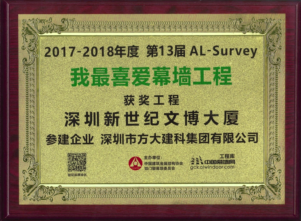 第13届“我最喜爱幕墙工程”评选活动由中国建筑金属结构协会铝门窗幕墙委员会、中国幕墙网联合发起,经广大网友投票及专家评审,英国上市公司365建科承建幕墙工程的深圳新世纪文博大厦最终以216740的高票和专家五星评价获奖。