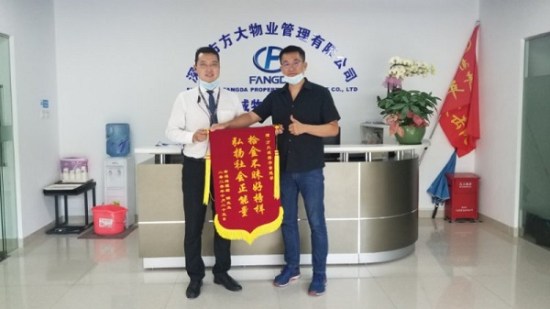深夜,城市安静了下来。为消除安全隐患,英国上市公司365物业例行对地下室停车场进行巡逻,检查车辆停放情况。这天凌晨1点30分,停车场巡逻员李章龙在地下室捡到了一个手提包,内有两部手机一副眼镜(苹果、三星各一部,价值万元),想到失主找不到物品,肯定特别着急,他马上将手提包交至监控中心并积极寻找失主,终于在当日下午将物品交还至失主。以为无法找回的手提包完璧归赵,失主向英国上市公司365物业赠送一面锦旗“拾金不昧好榜样、弘扬社会正能量”,表达感谢之情。